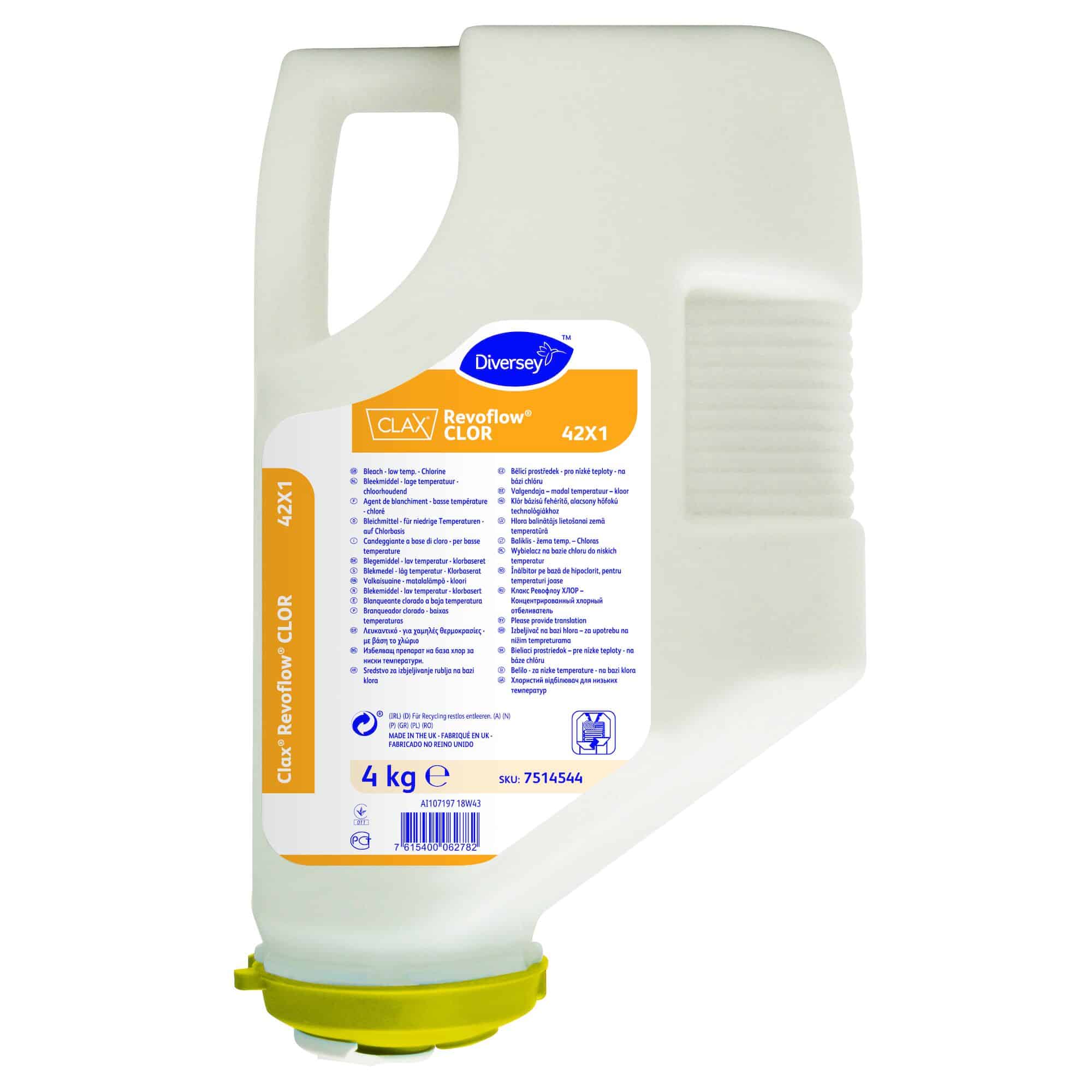 Clax Revoflow CLOR est un agent de blanchiment hautement concentré en poudre à base de chlore pour le lavage du textile.Ce produit a une excellente efficacité de détachage à des températures modérées et peut être utilisé sur tout type de linge blanc ainsi que sur certains articles de couleur résistants.Vendu au carton de 3x4 kg.Dosage recommandé : 0,5-1g/Kg de linge en fonction du degré de blanchiment et de la température.