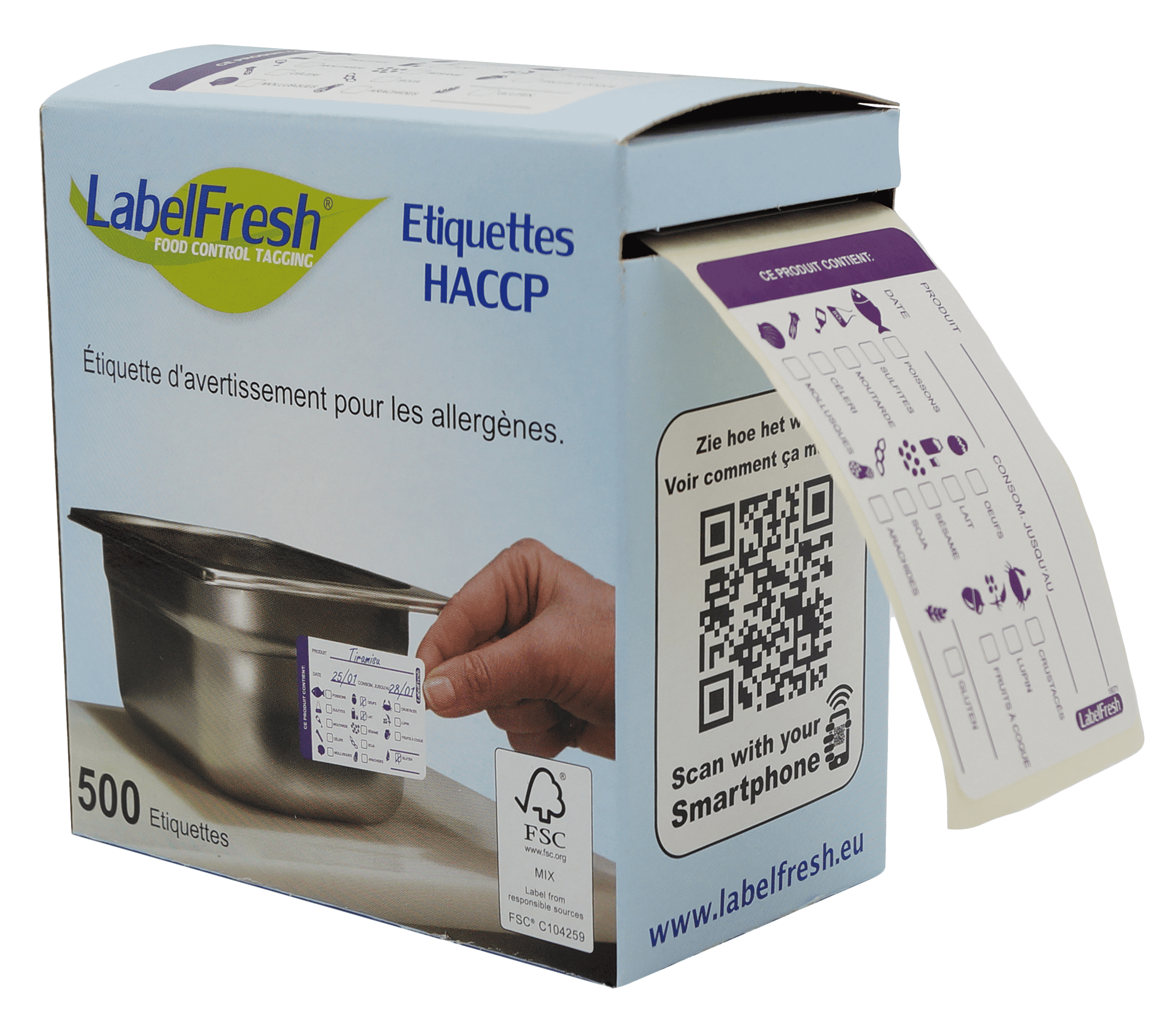 Etiquettes Labelfresh multi-allergènes pour les 14 allergènes les plus courants : oeuf, poisson, moutarde, sésame, arachides, sulfites, lactose, soja, crustacés, mollusques, lupin, céleri, gluten et fruits à coques.Dimensions : 70x45mmBoite de 500 étiquettes (6 boîtes dans un carton)